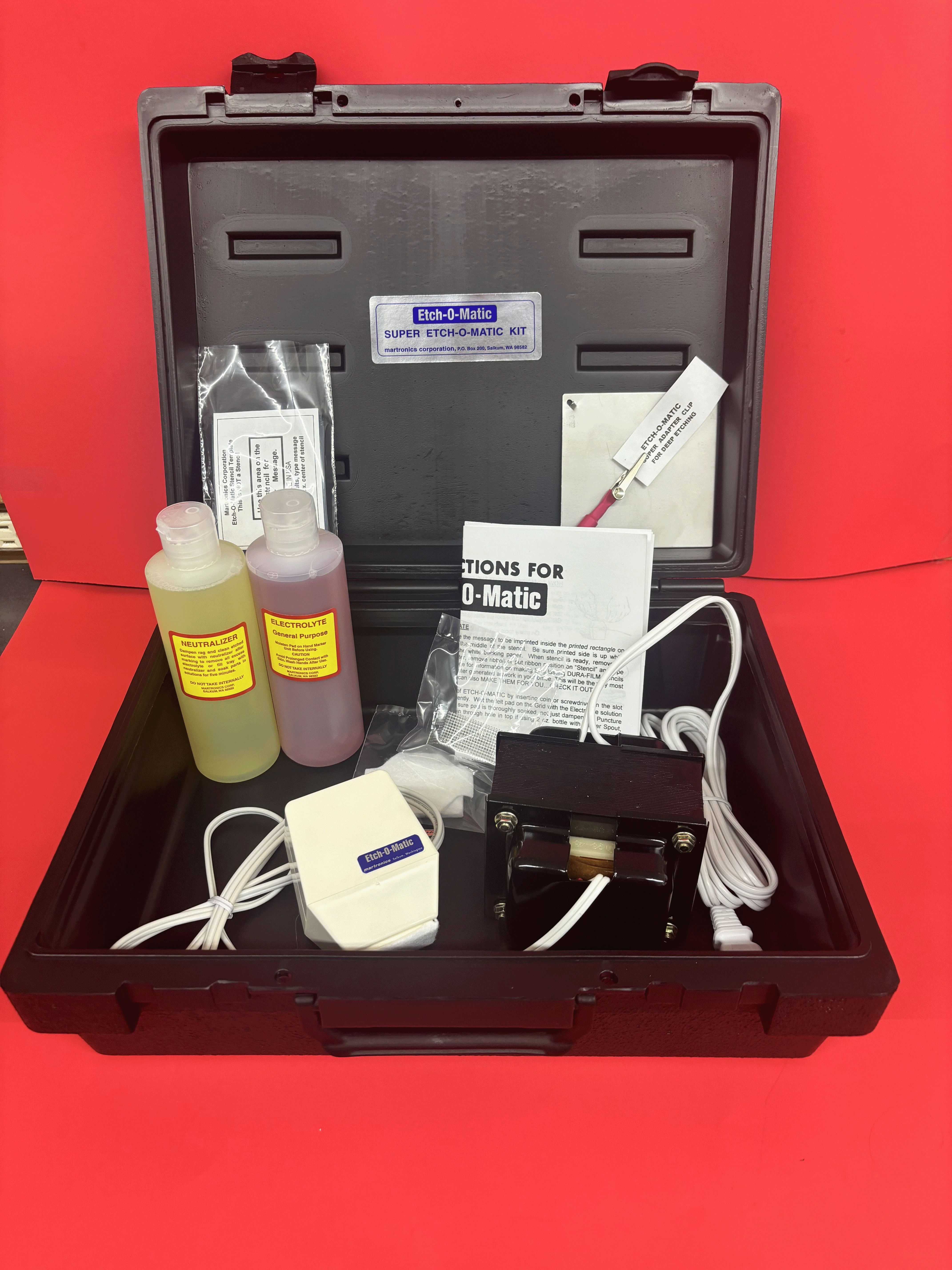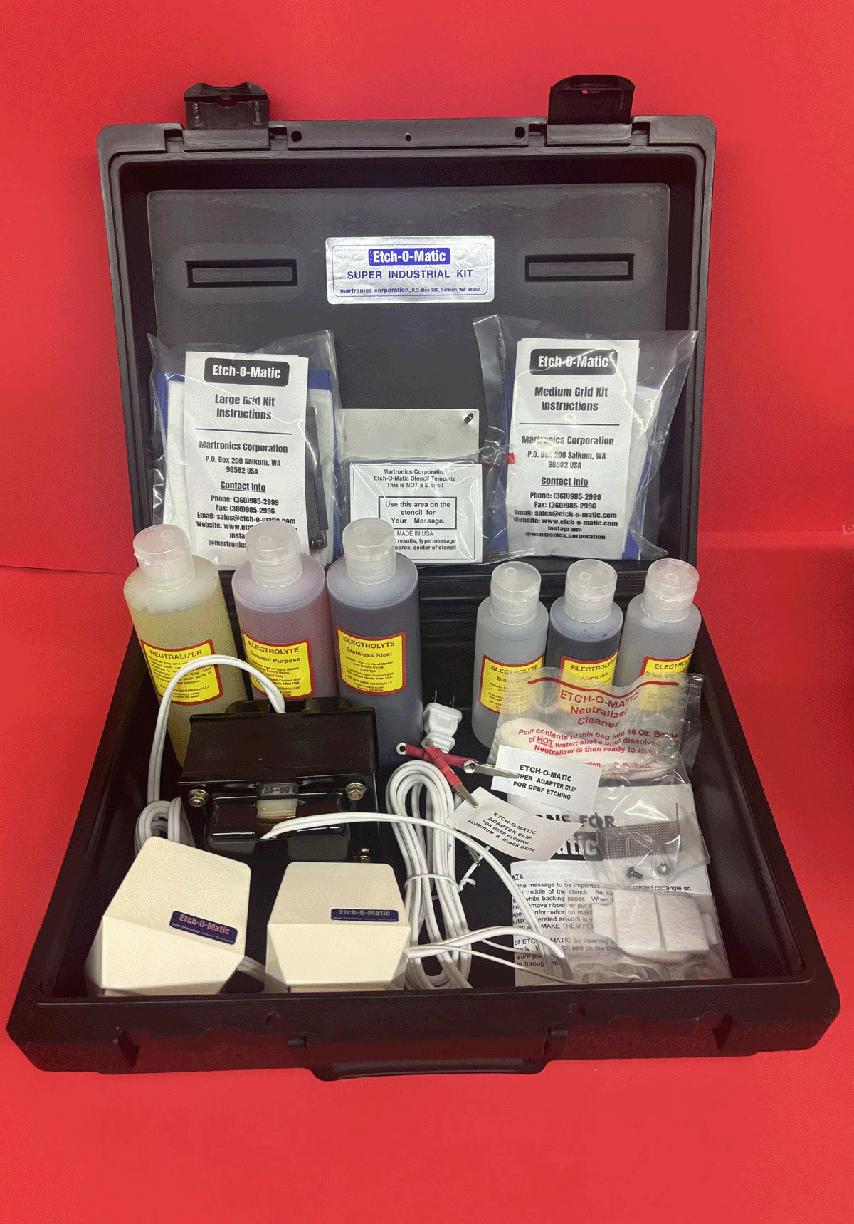 THE NEW SUPER ETCH-O-MATIC INDUSTRIAL KIT Combines the Best of Both of the TWO Kits Above and gives You enough Supplies to Mark Almost Any Type of Metal in the Average Plant. It also provides Great Value Because You get the Starter Kit 10-volt / 2-amp Unit Included FREE in the Kit.   Also Included is a Large 2" x 4" Grid that Allows You to Mark Much Larger Areas at the Same Time.   THIS IS REALLY A SUPER VALUE AT THIS LOW PRICE!
